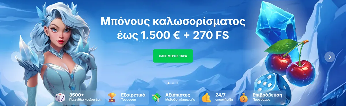 Καλώς ήρθατε στο Ice Casino Greece, τον κορυφαίο προορισμό για διαδικτυακά τυχερά παιχνίδια στην Ελλάδα. Προσφέρουμε περισσότερα από 3.500 συναρπαστικά παιχνίδια που σας περιμένουν να τα ανακαλύψετε, από κλασικά slots μέχρι ζωντανά παιχνίδια casino με επαγγελματίες dealers. Το Ice Casino διαθέτει άδεια λειτουργίας Curacao eGaming και προσφέρει απόλυτη ασφάλεια με γρήγορες συναλλαγές σε ευρώ και αδιάκοπη υποστήριξη στα ελληνικά. Απολαμβάνετε το μοναδικό μας μπόνους καλωσορίσματος 100% μέχρι 1.500€ + 270 δωρεάν περιστροφές που σας δίνει το ιδανικό ξεκίνημα για κέρδη. Η πλατφόρμα μας είναι πλήρως βελτιστοποιημένη για κινητά, επιτρέποντάς σας να παίζετε οποιαδήποτε στιγμή από το smartphone ή tablet σας. Διαθέτουμε ολοκληρωμένο πρόγραμμα υπεύθυνου παιχνιδιού, 24/7 εξυπηρέτηση πελατών και πολλαπλές μεθόδους πληρωμής συμπεριλαμβανομένων Visa, MasterCard και δημοφιλών e-wallets. Εγγραφείτε σήμερα και ξεκινήστε την περιπέτεια κερδών με το πιο αξιόπιστο online casino στην Ελλάδα.