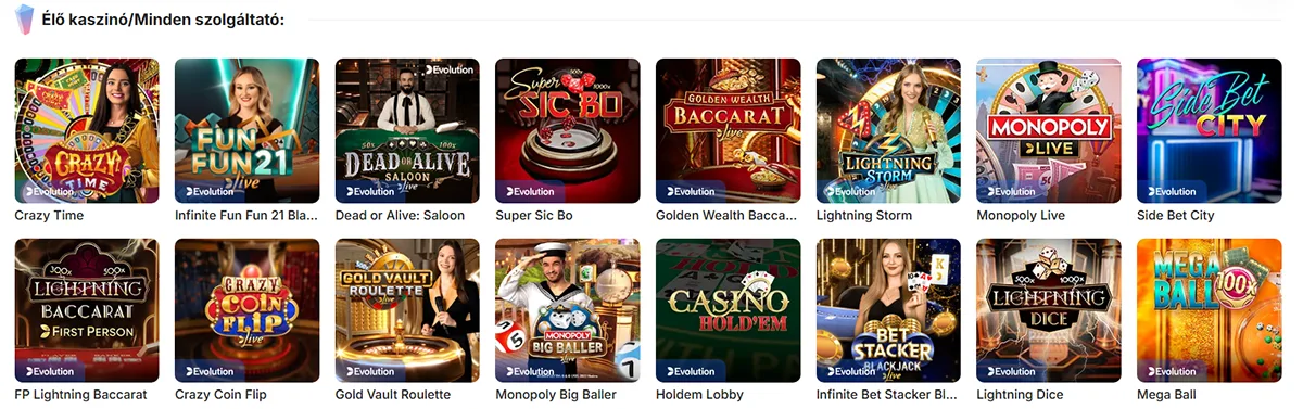 Valódi krupiékkal játszható élő asztali játékok az Evolution Gaming, Ezugi és Pragmatic Play kínálatából. Népszerű játékaink közé tartozik az élő rulett, blackjack, póker és a játékshow-k, mint a Mega Wheel.